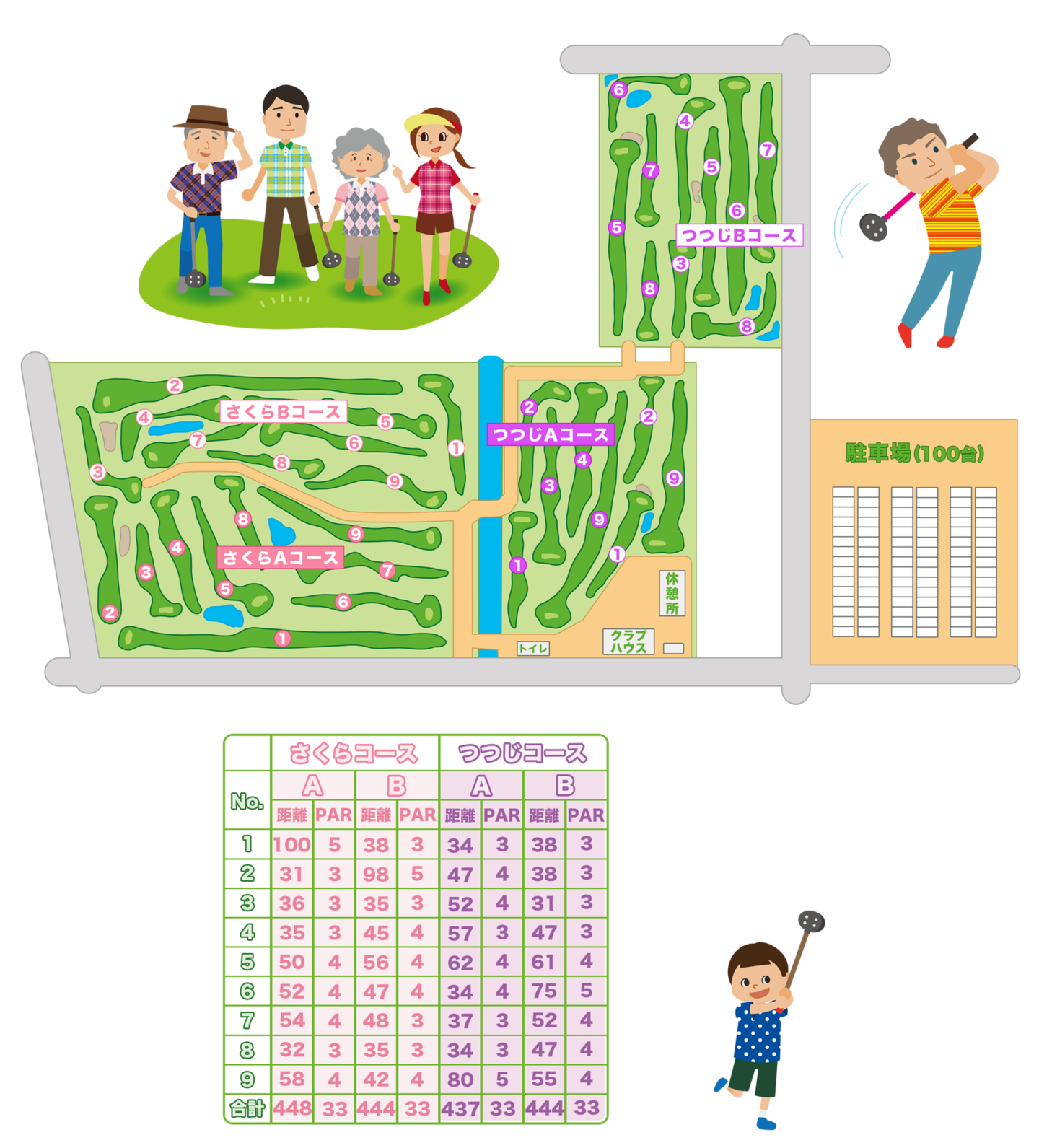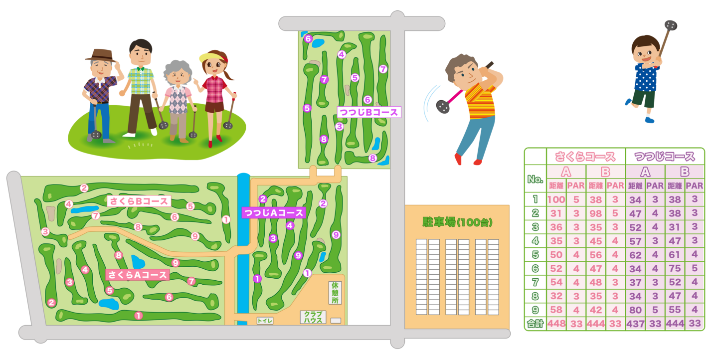 3万㎡の富士山が見える広い自然に囲まれた空間に36ホール1,743mのコースとバンカーがあります。ゆとりのある広々としたコースは大きい大会の開催も可能です。町内会・地域会・同好会・職場の様々なイベントにも対応できます。